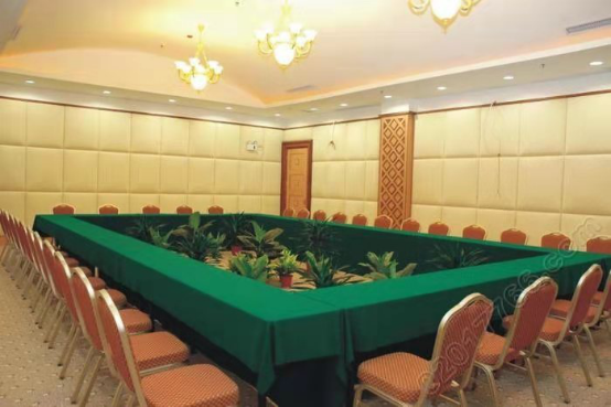 将会议桌连接摆成长方形,空出一条短边不摆桌子(留空),椅子摆在桌子外围,适合于中等人数会议,也是便于交流。